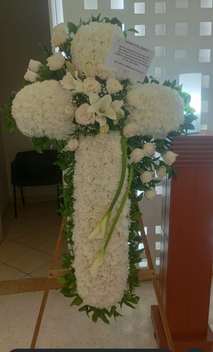La cruz fúnebre "Fe y Esperanza" es un tributo clásico y emotivo, perfecto para expresar condolencias con un profundo significado espiritual. Elaborada meticulosamente sobre una estructura sólida, esta cruz combina rosas blancas y flores estacionales de alta calidad, creando un diseño armonioso y sereno.